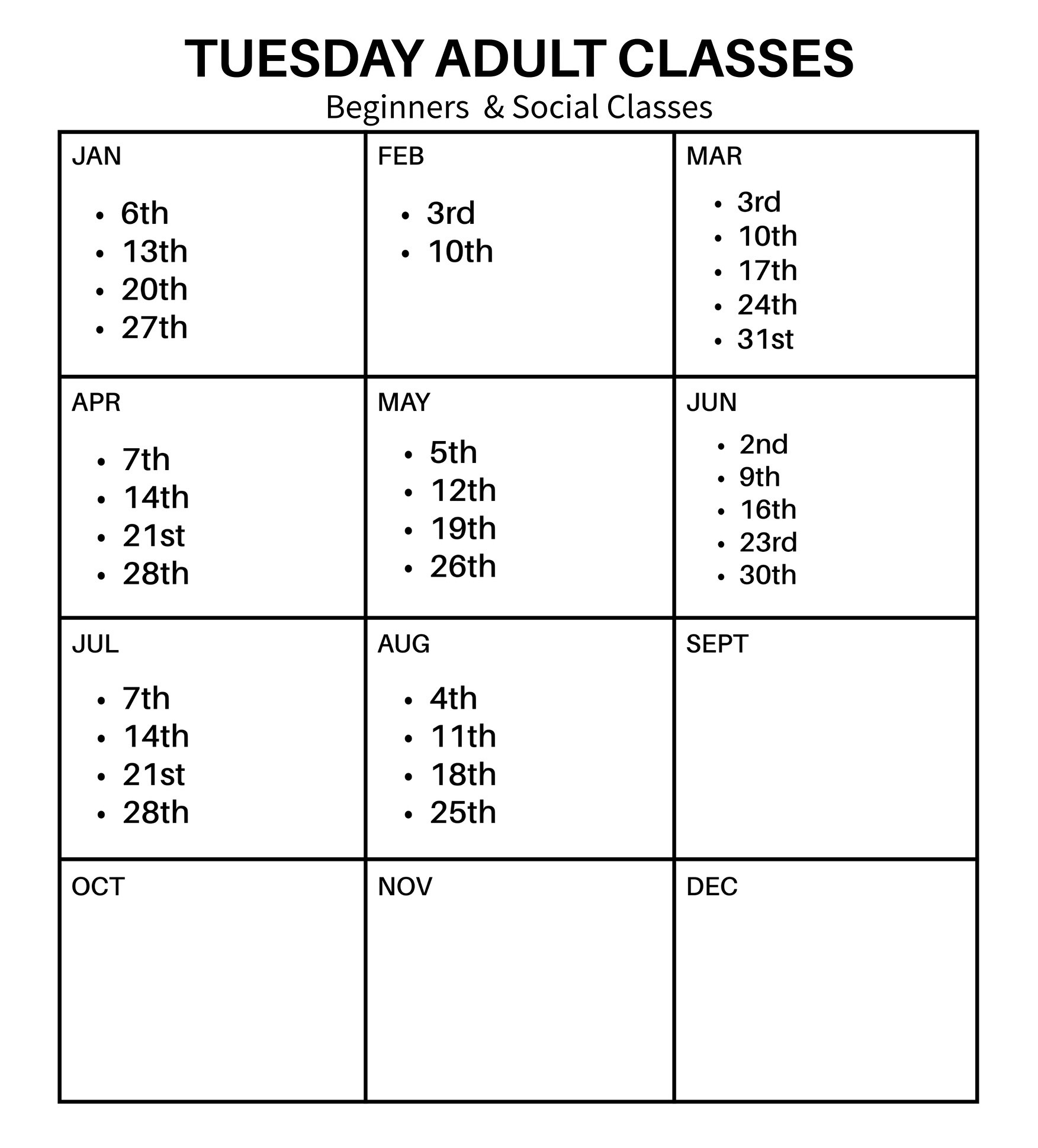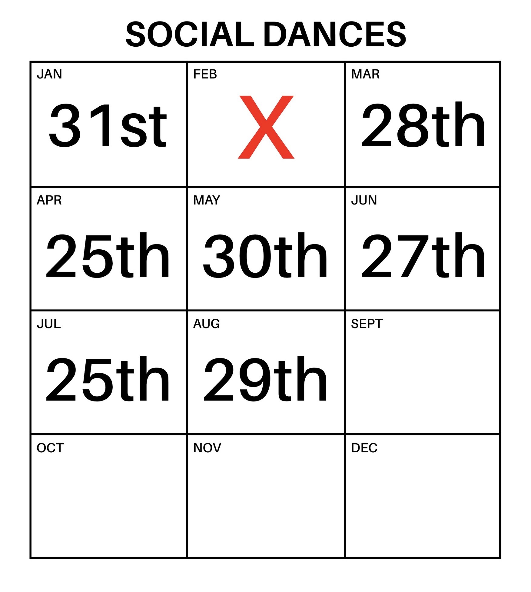 Here you’ll find all the key dates for our classes, practice sessions, social dances, and special events throughout the year.
